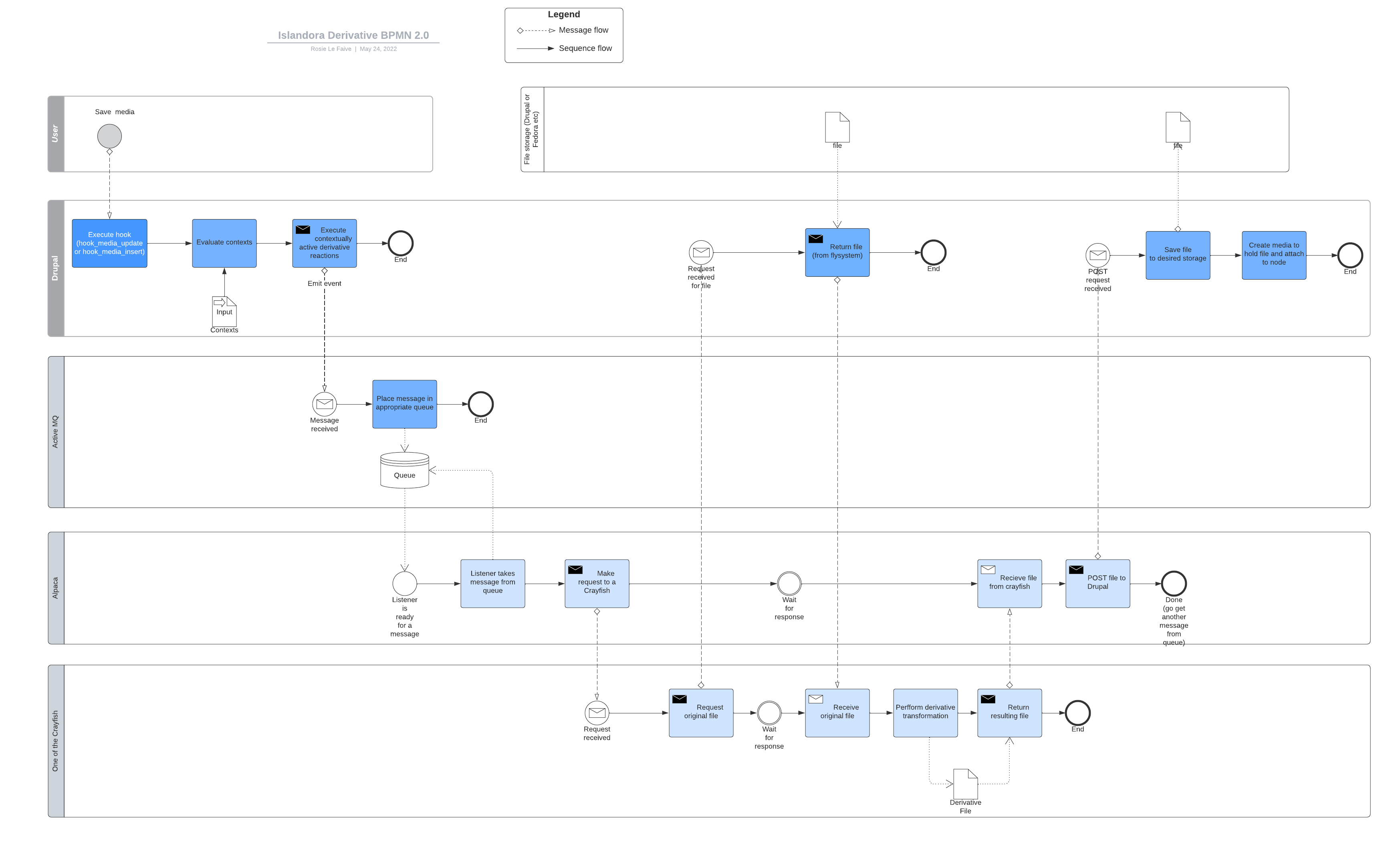 The following diagram shows the flow of derivative generation from start to finish. A user saves a Media in Drupal, which may trigger Drupal to emit a derivative event to a queue, which is read by Alpaca and sent to a microservice. The microservice gets the original file and makes a transformation, returning the derivative file to Alpaca, which sends it back to Drupal to become a Drupal Media.